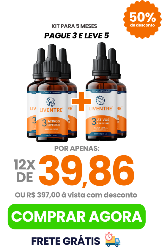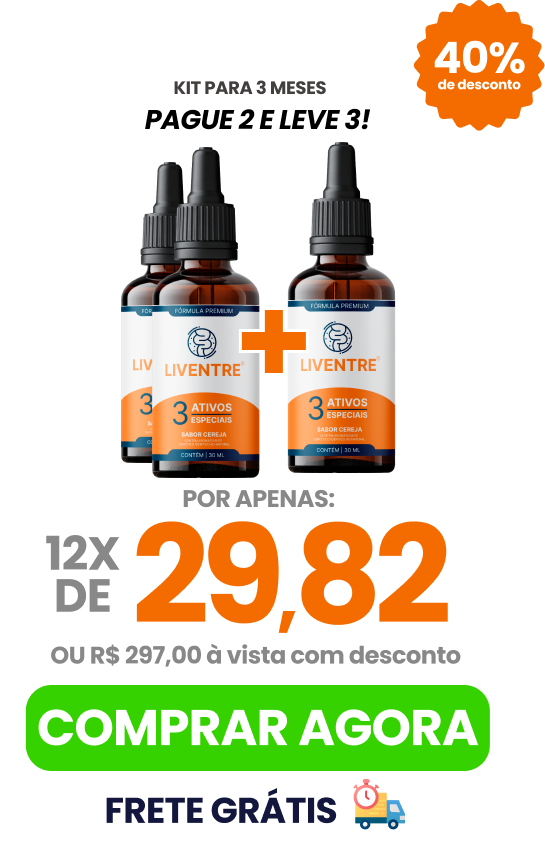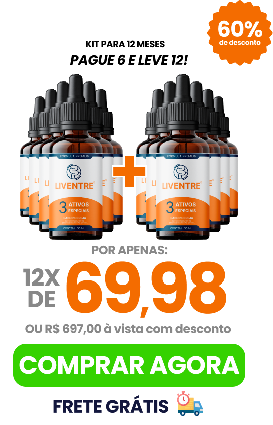 ”Liventre é o regulador intestinal com maior taxa de eficácia no mercado brasileiro, foi criado após anos de estudo, aonde eu criei a fórmula perfeita que age diretamente no intestino, combatendo a constipação, regulando o intestino, eliminando o inchaço abdominal e os gases, sem precisar fazer uso de laxantes e sem medo, pois é natural.”